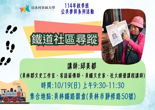 鐵道尋蹤由鐵道發展看地方-鐵道發展呈現不同的特色與樣貌, 早年員林臺鐵、糖鐵、 輕鐵三鐵共構的歷史風華,見證社區發展脈絡,形成在地重要的共同生活記憶,跟著鐵道文史家邱美都老師,帶著我們走進員鐵社區,來場趣味的鐵道尋蹤,體驗鐵道播音員的樂趣,透過社區攝影達人保留的老照片,重拾往昔生活點滴。
