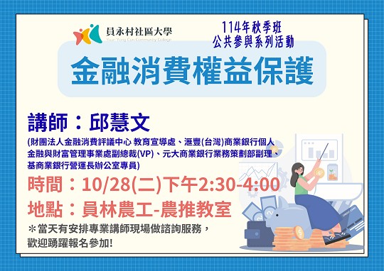 📍講師: 邱慧文 講師(滙豐(台灣)商業銀行個人金融與財富管理事業處副總裁(VP)、元大商業銀行業務策劃部副理、凱基商業銀行營運長辦公室專員)
