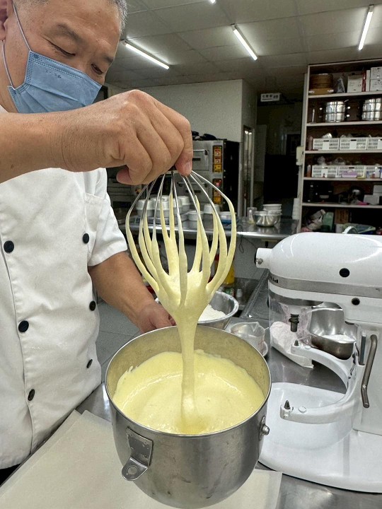 學員們動手實作糖、油、麵粉的黃金比例,在揉、壓、折的過程中感受烘焙的樂趣。老師深入講解各類材料在製作過程中的角色與變化,每個細節都充滿學問。大家也親自比較動物性奶油與植物奶油在打發時的不同效果,透過實作理解烘焙背後的原理。整個教室裡瀰漫著甜點的香氣!